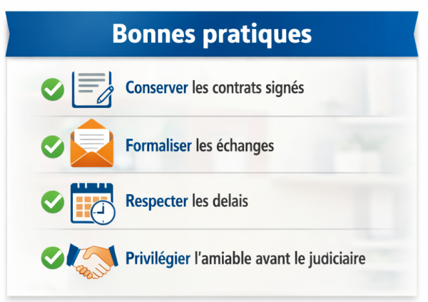 Chaque partie doit être en mesure de justifier ses prétentions à l’aide d’éléments probants (contrats, factures, courriers, échanges électroniques). Le respect des délais, des procédures et des décisions rendues est fondamental, sous peine de sanctions juridiques ou d’aggravation du différend.