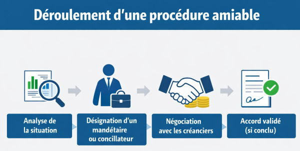 - La procédure amiable permet de négocier avec ses créanciers sans aller immédiatement devant le tribunal.