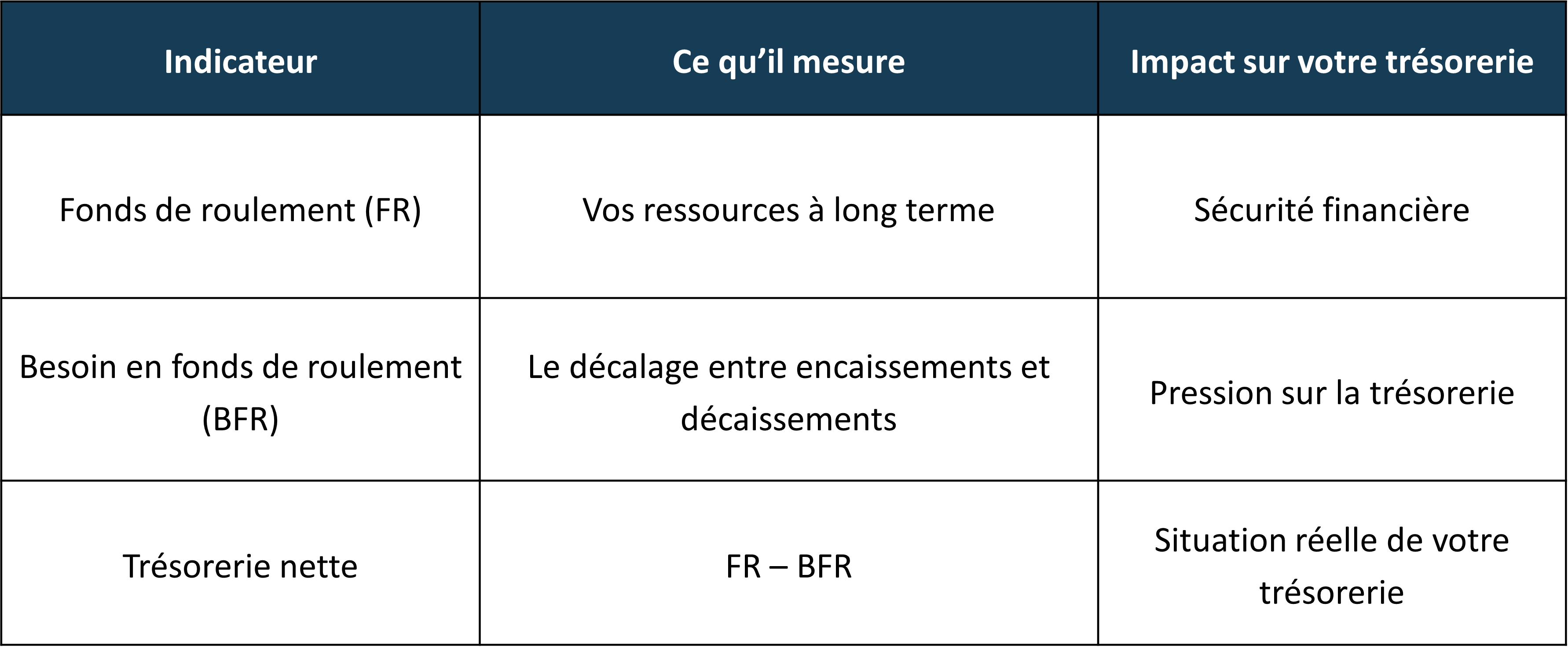 - Le fonds de roulement, le besoin en fonds de roulement (BFR) et la capacité d’autofinancement sont les indicateurs financiers clés à suivre.
