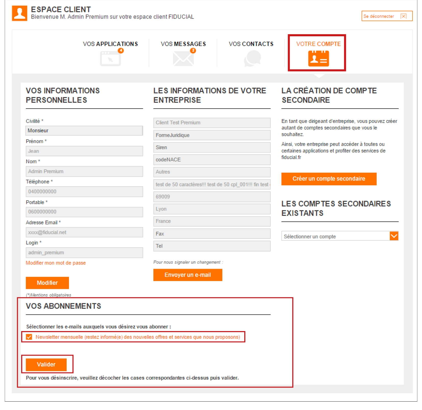 - Votre compte : Modifiez en direct, à tout moment, vos informations personnelles et gérez vos abonnements aux e-mailings de FIDUCIAL ;