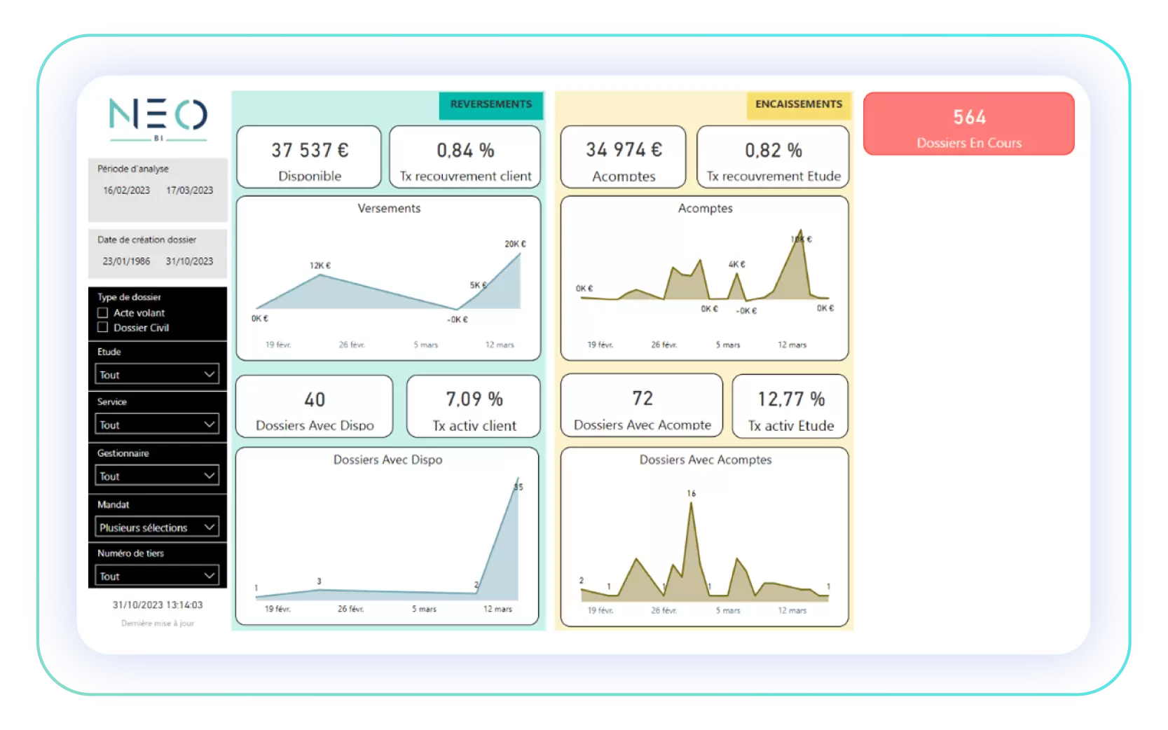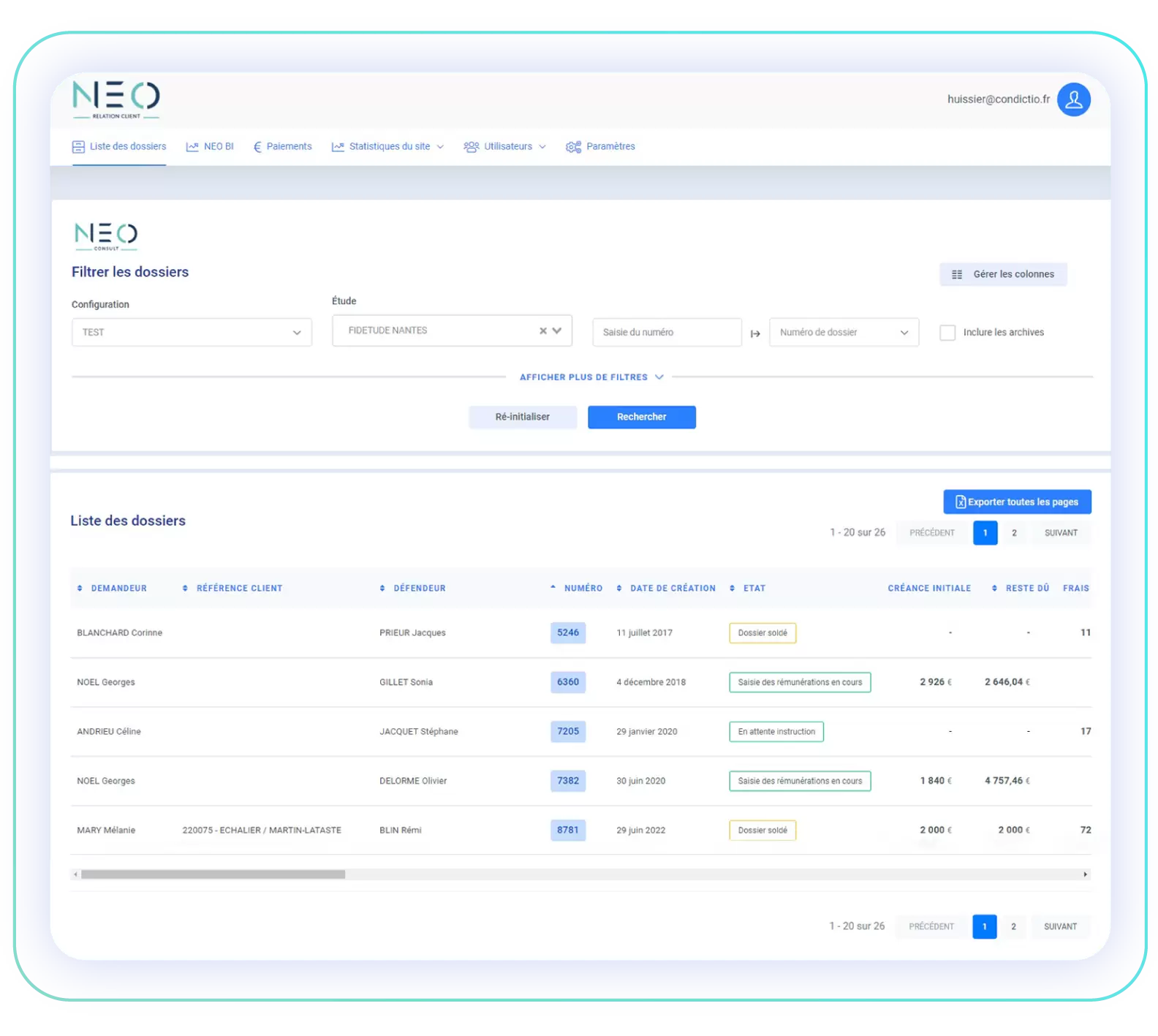 NEO Relation Client permet un suivi de dossiers convivial, sécurisé et maximise votre productivité avec des indicateurs de performance puissants mis à jour en temps réel.