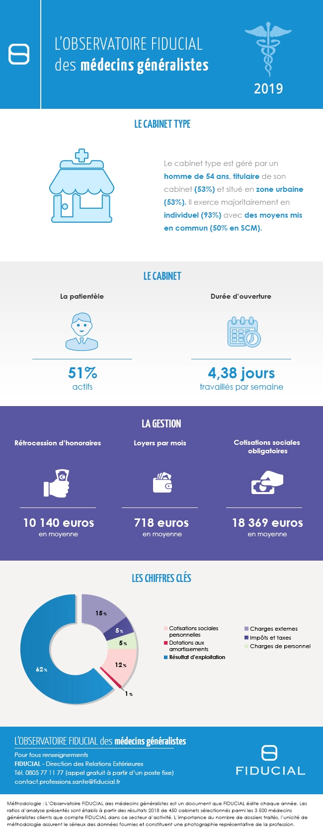 En 2019, le cabinet type est géré par un homme (62 %) de 54 ans en moyenne, se situe plutôt en milieu urbain (53 % des répondants) et soigne une patientèle composée de 51 % d’actifs et de 30 % de retraités.