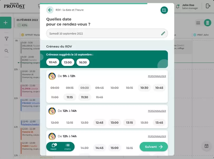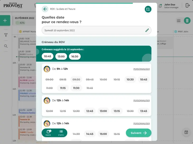 Vous pouvez planifier les rendez-vous de vos clients en sélectionnant la date et l'heure souhaitées pour le rendez-vous, puis en choisissant le coiffeur ou la coiffeuse que vous souhaitez affecter à ce rendez-vous.