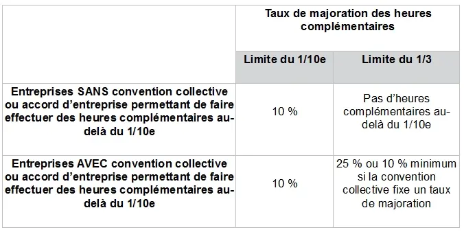 - Les heures complémentaires réalisées dans la limite de 1/10e de la durée du travail prévue au contrat sont désormais majorées de 10 %. Cette majoration s’applique aux heures complémentaires.