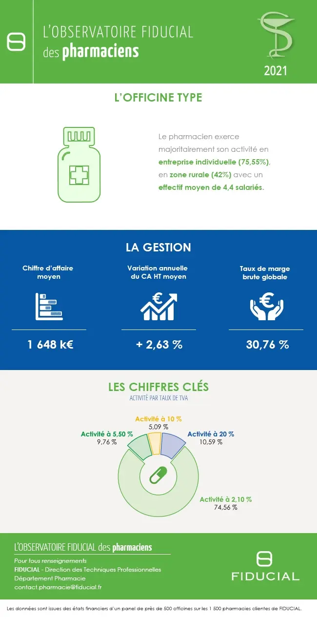 Les données sont issues des états financiers d’un panel de près de 500 officines sur les 1 500 pharmacies clientes de FIDUCIAL.