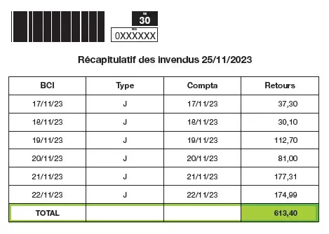 Ce document reprend les montants des « Retours » jour par jour afin de permettre une vérification avec le Bordereau de Crédit d’Invendus (BCI) de la journée.