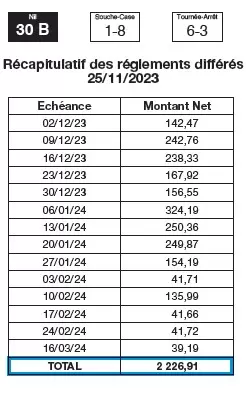 Dans notre exemple, la livraison de la semaine est à payer au comptant pour 350,62 €, à diminuer des règlements différés pour