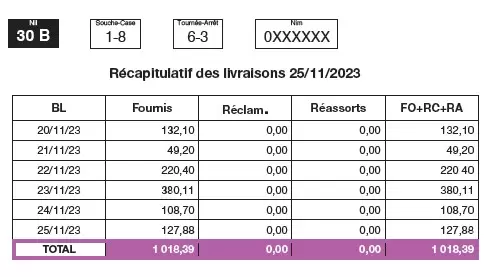 Ce document reprend les « Fournis » de la semaine en indiquant les montants livrés jour par jour afin de permettre un rapprochement avec le bordereau de livraison (BL) de la journée correspondante.