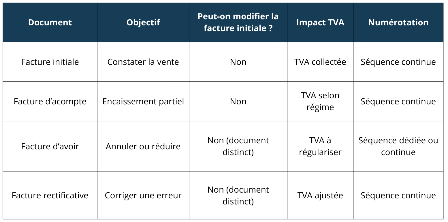 - La facture initiale : elle enregistre la vente d'un produit ou d'une prestation de service et déclenche l'obligation de paiement.