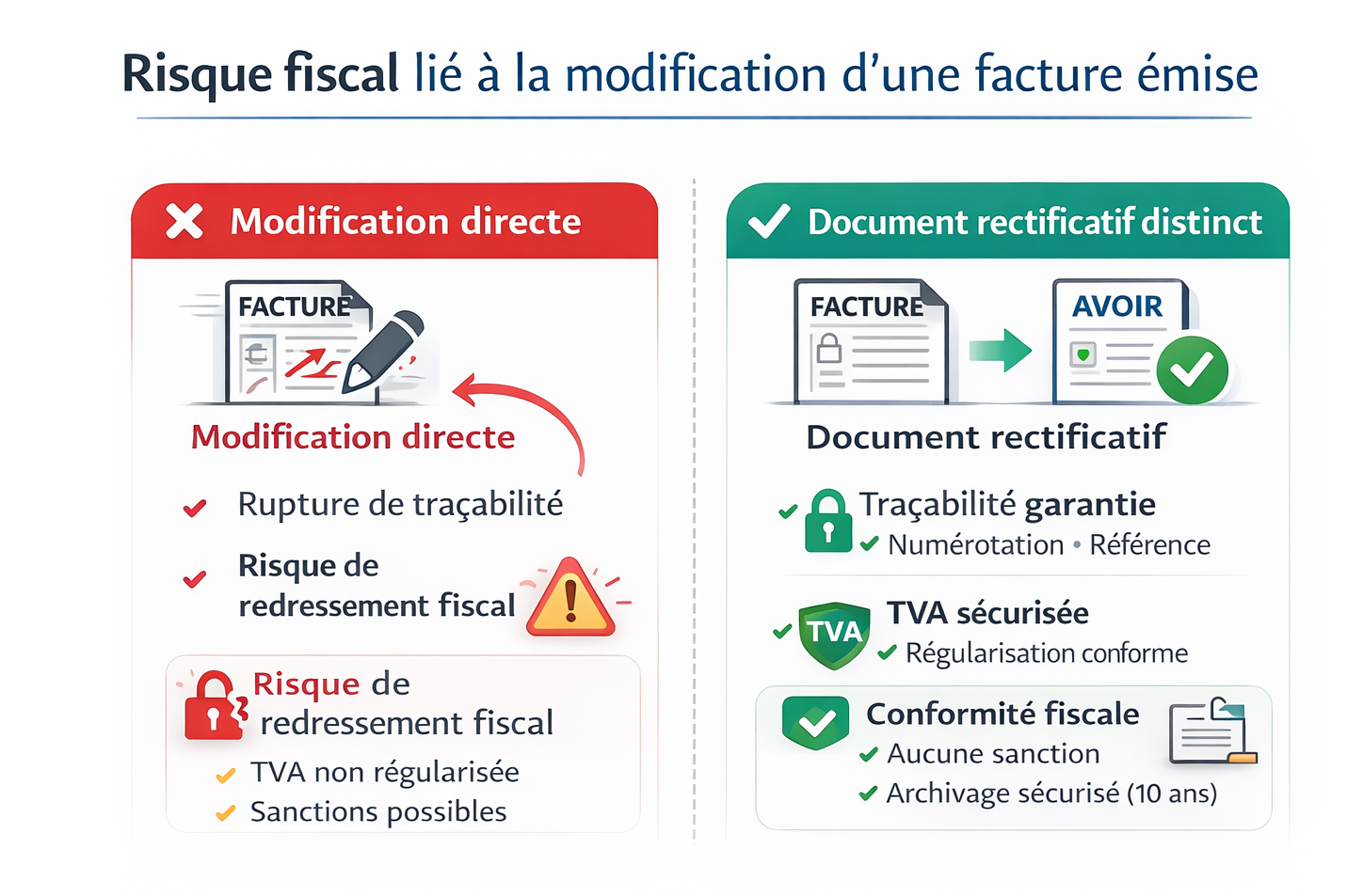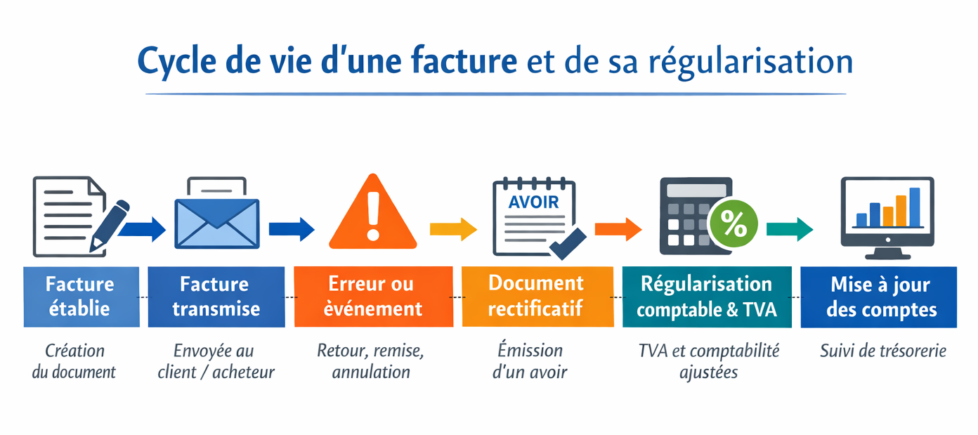 Cette exigence s’inscrit dans les obligations de conservation, de traçabilité et d’inaltérabilité des données de facturation, afin de garantir l’intégrité des écritures et de la TVA. L’avoir permet d’opérer une régularisation comptable et fiscale traçable, sans altérer la facture d’origine.
