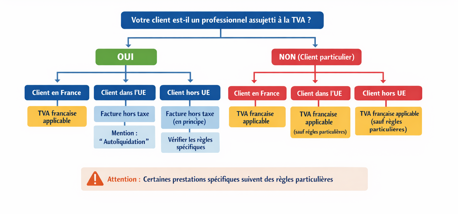 ⚠️ Attention : certaines prestations suivent des règles particulières prévues par le Code général des impôts.(par exemple les services liés à un immeuble, certains services “immatériels” fournis à des clients hors Union européenne, ou encore d’autres exceptions prévues par la loi). En cas de doute, il est recommandé de vérifier le traitement applicable avant d’émettre la facture. Pour cela, n’hésitez pas à vous rapprocher de votre expert-comptable.