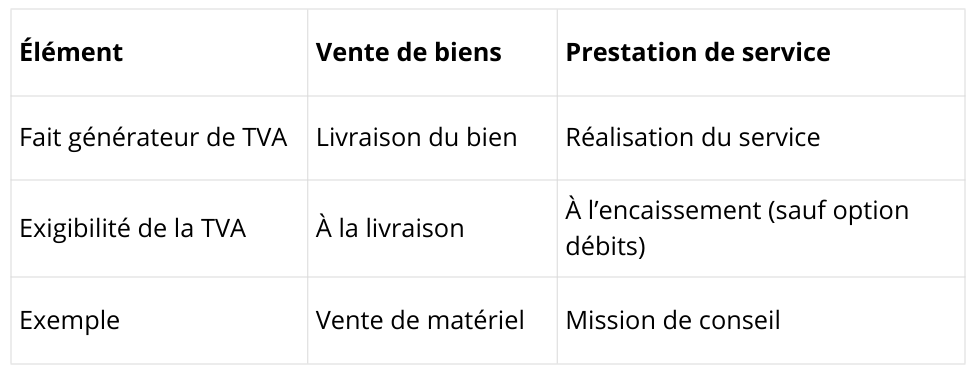 - Pour les prestations de services, la TVA est en principe exigible lors de l’encaissement, sauf option pour les débits.