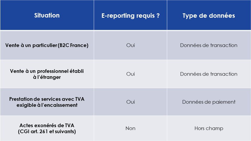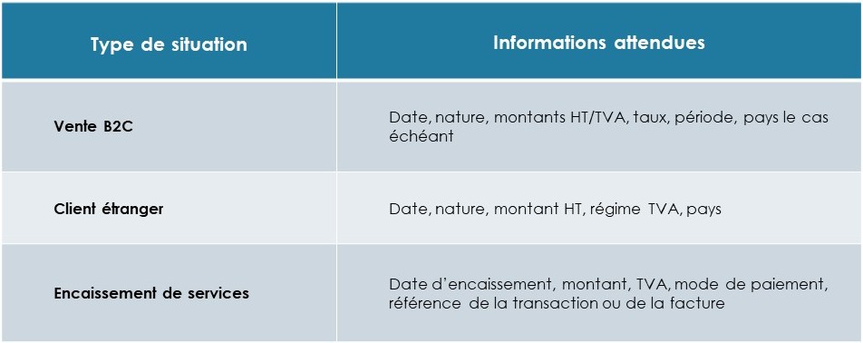 - Il complète la facturation électronique en couvrant notamment les ventes aux particuliers, les transactions internationales et les encaissements de prestations de services.