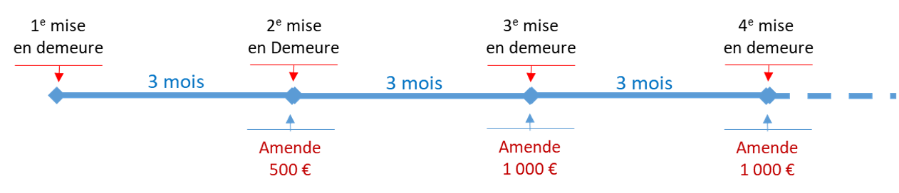 Dans le cas contraire, cet assujetti est passible d’une amende de 500 € après que l’administration fiscale l’a mis en demeure de s’y conformer dans un délai de trois mois. Si, après l’application de cette sanction et une nouvelle mise en demeure, la situation au terme d’une nouvelle période de trois mois ne change pas, l’amende encourue s’élève alors à 1 000 €. Et ainsi de suite tous les trois mois.