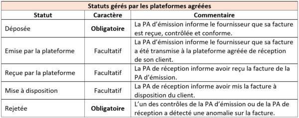 Les statuts à caractère facultatif ne remontent pas à l’administration fiscale. Ils pourront être créés et gérés à la condition que les PA et leurs outils de gestion intégrés ou interconnectés le permettent. À défaut, le fournisseur et/ou le client seront limités à l’usage des seuls statuts obligatoires.