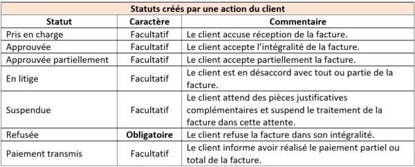 Avant d’opérer un refus, le client pourra utiliser les autres statuts facultatifs (approuvée partiellement, en litige, suspendue). Toutefois, ces statuts n’interrompent pas nécessairement les délais de paiement, tout comme un usage abusif du statut « refusé », surtout si le client tarde à les mettre en œuvre.
