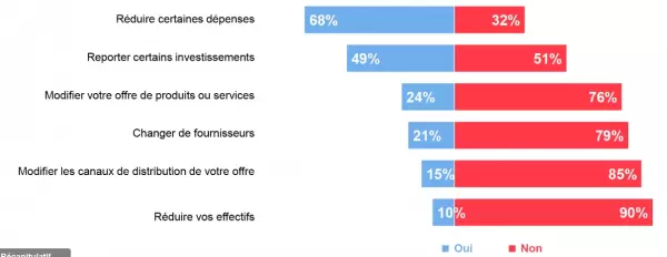 En complément, 79% des chefs d’entreprise ont pris au moins une mesure pour leur société, parmi lesquelles figurent la réduction de dépenses pour 68% d’entre eux et le report de certains investissements pour 49%.