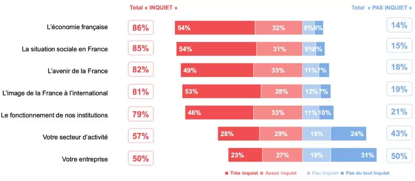 Dans ce contexte, une majorité écrasante se déclarent inquiets pour l’économie française (86 %), la situation sociale en France (85 %), l’avenir de la France (82 %), l’image de la France à l’international (81 %) et le fonctionnement de nos institutions (79 %).