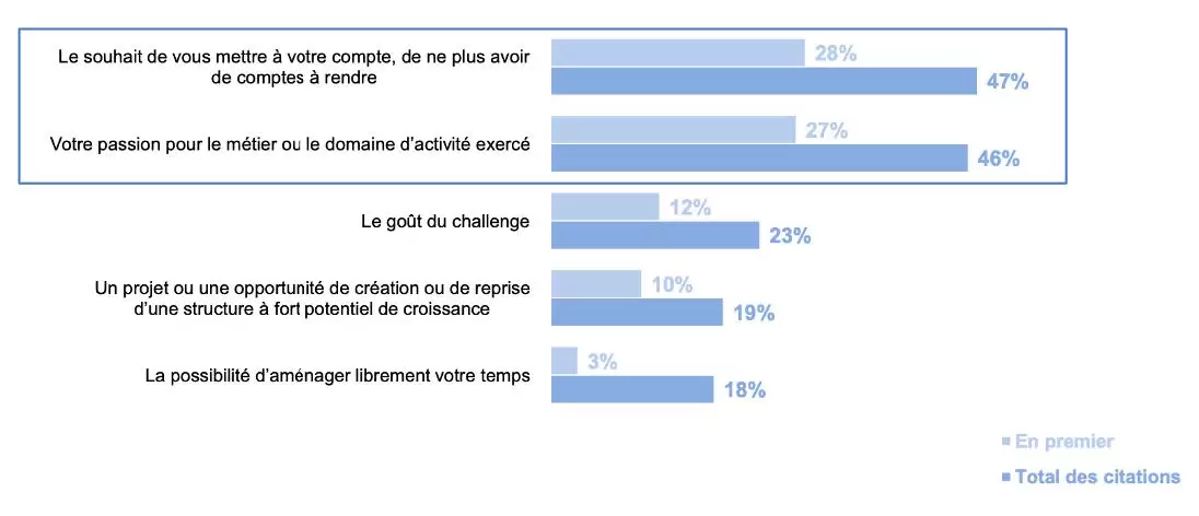 La liberté d’entreprendre et la volonté d’indépendance constituent toujours les principales motivations à créer ou reprendre une entreprise : près d’1 patron sur 2 (47 %) justifie son projet par le souhait de se mettre à son compte, de ne plus avoir de compte à rendre. La seconde principale motivation est celle de la passion du métier (46 %). Les dirigeants sont aussi animés par le goût du challenge (23 % vs. 14 % en 2010).