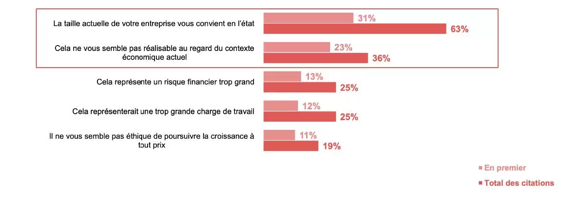 Sur les 38 % de patrons souhaitant maintenir la taille de leur entreprise en l’état, 36 % justifient ce choix au regard du contexte économique actuel, incertain et donc plus propice à limiter les ambitions de croissance, tandis qu’une nette majorité de 63 % se déclarent avant tout satisfaits de la taille actuelle de leur structure.
