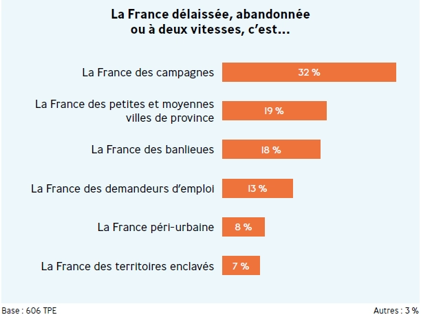 Néanmoins, aucun patron de TPE pour ainsi dire ne pense que le gouvernement privilégie les territoires ruraux aux villes, mais 57 % estiment qu’il s’occupe moins des territoires ruraux que des villes. Une majorité des entrepreneurs ruraux jugent même que les pouvoirs publics en font trop pour Paris et la métropole du Grand Paris. Mais la plupart des chefs d’entreprise, quelle que soit leur origine, s’accordent à reconnaître une action publique insuffisante à l’égard des zones périurbaines, et en particulier des banlieues en difficulté ainsi que des campagnes.