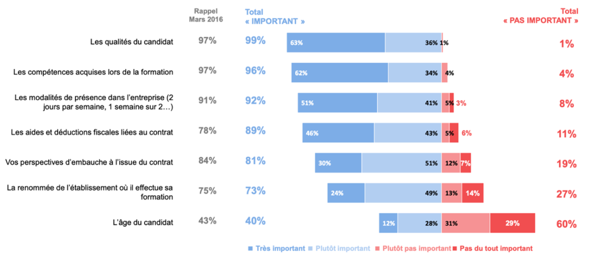 En tête, les qualités du candidat (99% soit +2 points qu’en mars 2016), les compétences acquises lors de la formation (96%, -1 point) et les modalités de présence dans l’entreprise (92%, +1 point).