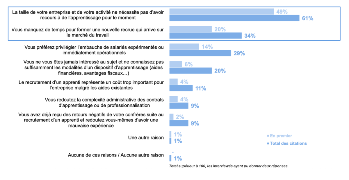 Les deux raisons suivantes sont évoquées en minorité : manque de temps disponible et dédié à la formation d’une nouvelle recrue (34%) et volonté de privilégier plutôt l’embauche de salariés expérimentés et immédiatement opérationnels (29%).