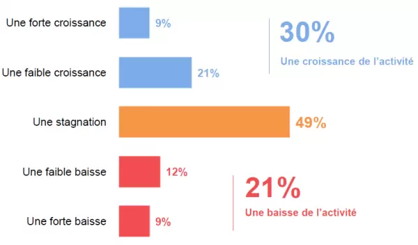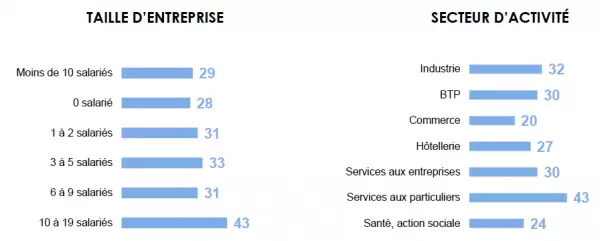 Interrogés sur leurs prévisions pour 2024, 49 % des dirigeants envisagent plutôt une stagnation de leur activité, 30 % veulent miser sur leur croissance et 21 % envisagent plutôt une baisse. Les plus grandes TPE de 10 à 19 salariés et les entreprises de services aux particuliers sont les plus optimistes avec 43 % qui projettent une croissance de leurs affaires. A l’inverse, seules 20 % des entreprises du commerce envisagent une année 2024 plus dynamique.