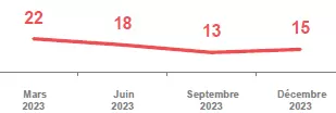 Parmi les 15 % d’entrepreneurs en difficultés importantes, ceux qui envisagent de déposer le bilan ou cesser leur activité DANS LES 6 MOIS (Évolution du T1 au T4 2023)