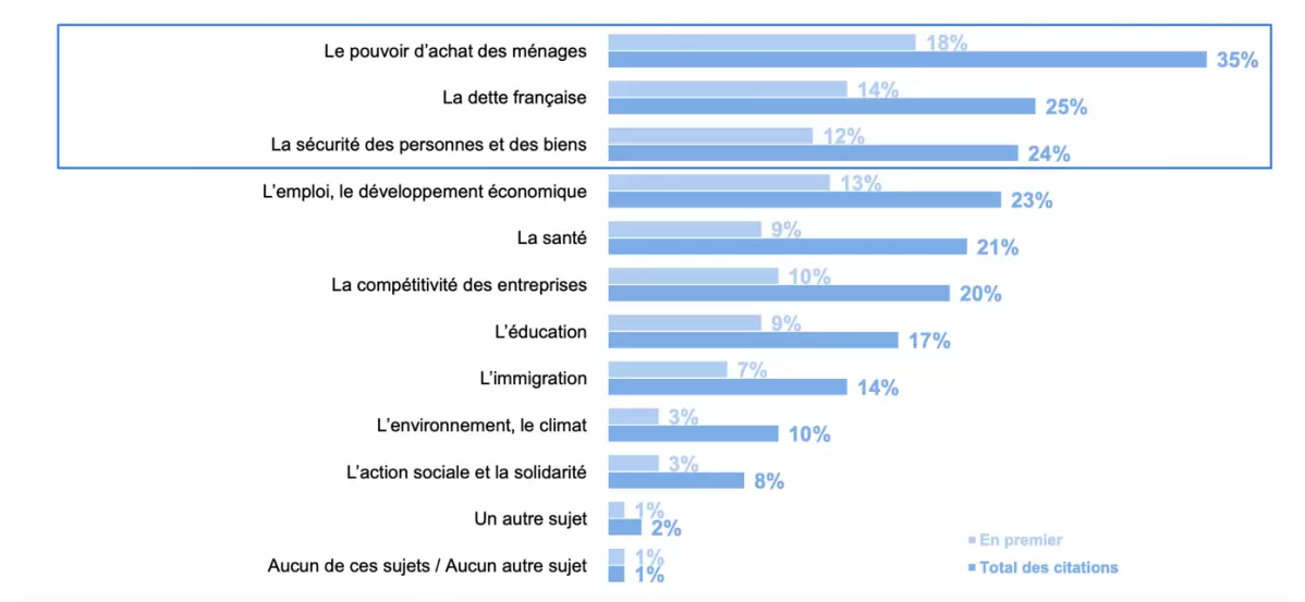 Le pouvoir d’achat des ménages arrive en tête des priorités : 35 % des patrons considèrent que ce sujet devrait être traité en priorité par le gouvernement. La dette française arrive en seconde position (25 %) – avec tout de même un écart conséquent de 10 points. En troisième position, on retrouve la sécurité́ des personnes et des biens (24 %).