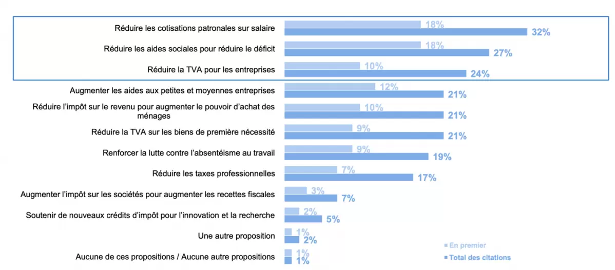 Les mesures d’aide aux petites et moyennes entreprises, la réduction de l’impôt sur le revenu pour augmenter le pouvoir d’achat des ménages, ou encore la réduction de la TVA sur les produits de première nécessité sont ensuite citées par 21 % des patrons.