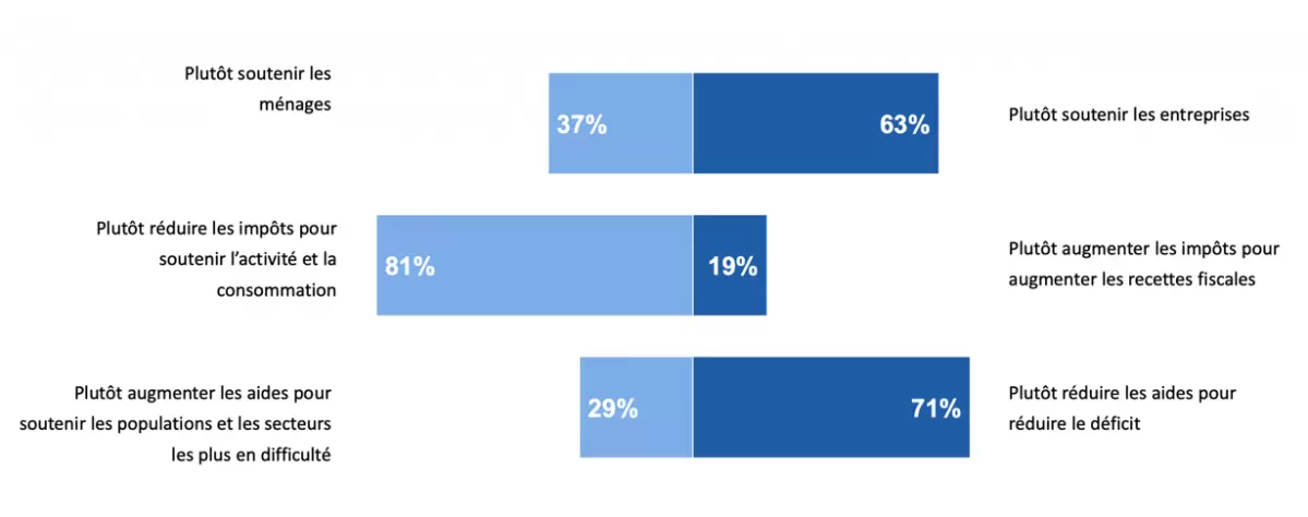 Logiquement pro-business, les dirigeants de TPE plébiscitent davantage des mesures fiscales en faveur des entreprises : 63 % considèrent qu’il est prioritaire de soutenir les entreprises plutôt que de soutenir les ménages. Ils se montrent largement favorables à une baisse des impôts : 81 % pensent qu’il faut réduire les impôts pour soutenir l’activité et la consommation.