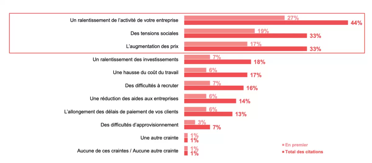 44 % craignent un ralentissement de leur activité et 33 % s’inquiètent de la résurgence des tensions sociales et de l’augmentation des prix