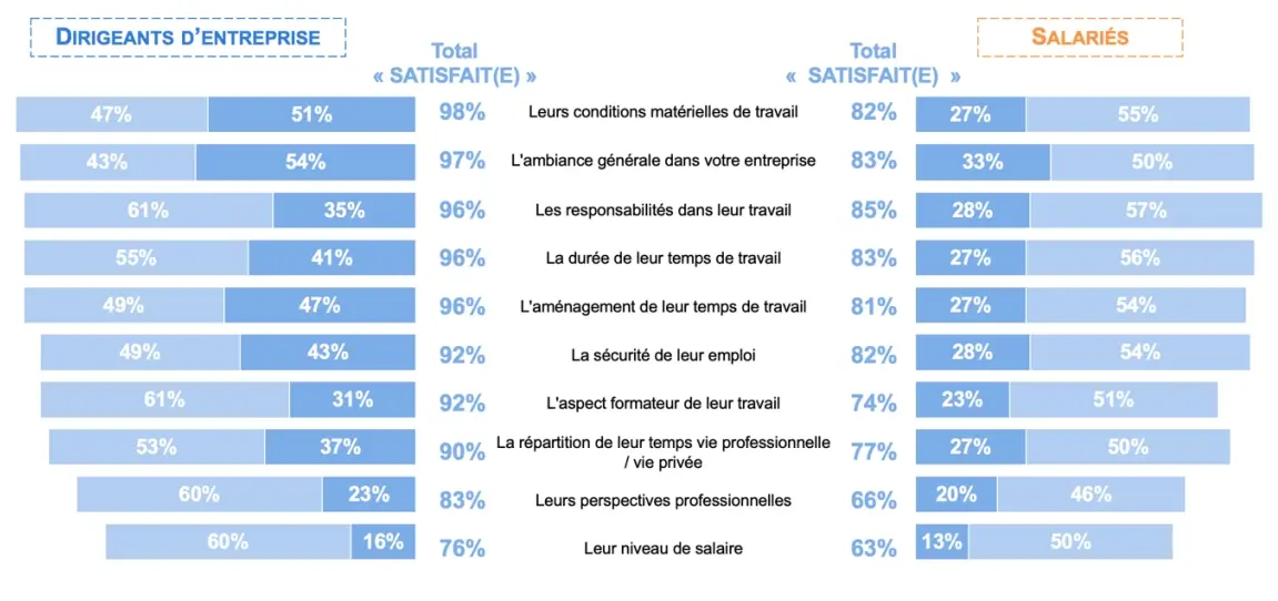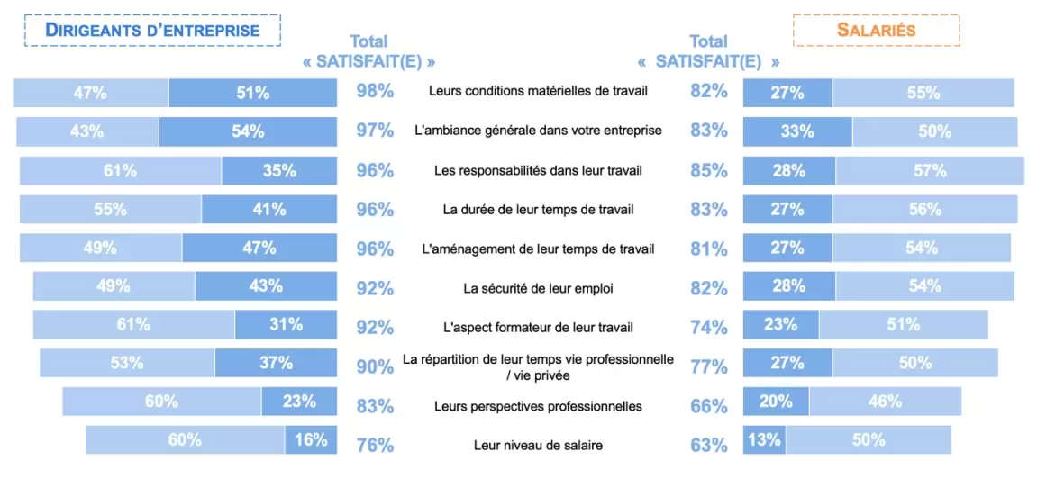 97 % des chefs d’entreprise déclarent être satisfaits de leurs employés, dont une large majorité (59 %) très satisfaits. Les salariés sont quant à eux satisfaits à 82 % de leur situation professionnelle, dont 25 % très satisfaits, une proportion supérieure à la moyenne des salariés français (74 % et 13 %).