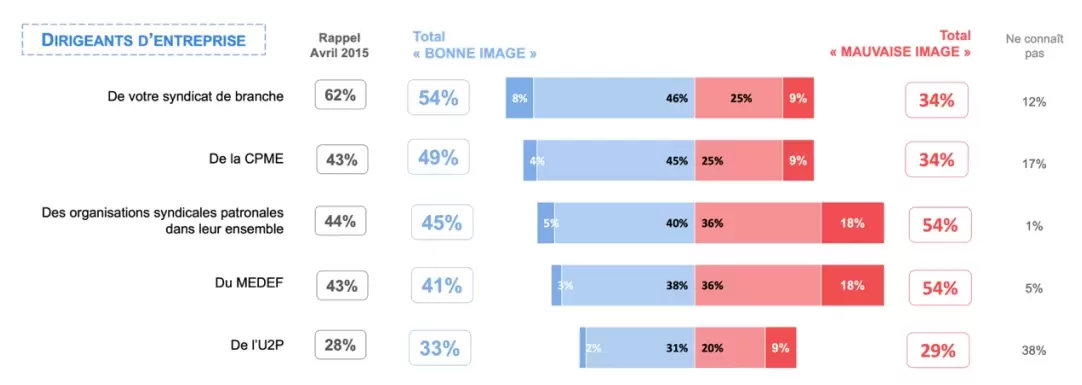 Aucune des autres organisations syndicales testées ne bénéficient en majorité d’une bonne image : qu’il s’agisse de la CPME (49 %) de l’UPA (33 %) ou de l’UNAPL (32 %), ces deux derniers ayant fusionné au sein de l’U2P.