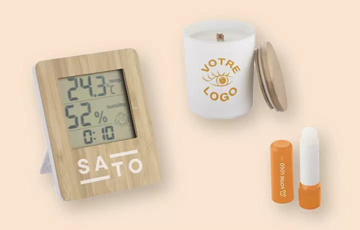 Bougie, éventail, baume, porte-clés, vos objets du quotidien sont tous personnalisables. Ces petites attentions sont idéales pour fidéliser vos collaborateurs ou offrir à vos clients une expérience unique avec votre marque.