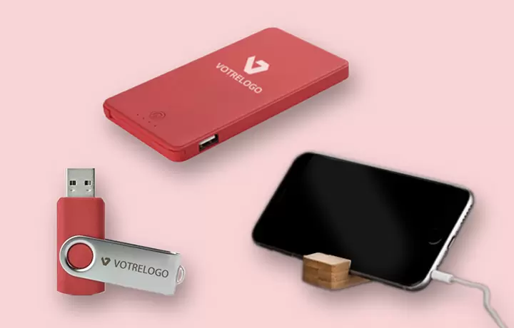 Choisissez d’imprimer votre marque sur un support technologique pour associer votre image à l’innovation ! Effet premium garanti. Clé USB, batteries externes, support de téléphone... explorez notre gamme d’objets publicitaires high-tech.
