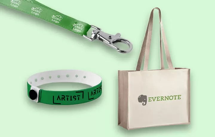 Bracelet, porte-badge, tour de cou, tote bag, éco-cup, nous avons tous les indispensables pour vos événements professionnels (salons, conférences, festivals ou fêtes d’entreprise). À personnaliser sans modération.